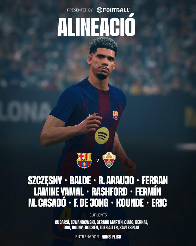 巴萨vs埃尔切:亚马尔、拉什福德首发,卡萨多、阿劳霍出战